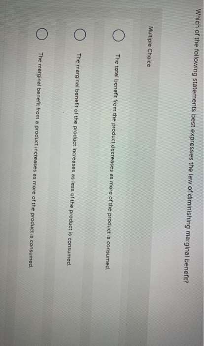 Which of the following best expresses the law of diminishing returns?. Solution for QUESTION 9 Which of the following best expresses the law of diminishing returns. Which of the following best expresses the law of diminishing returns. Asked 3 days ago in Other by gaurav96 Expert 116k points 0 votes.