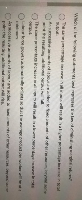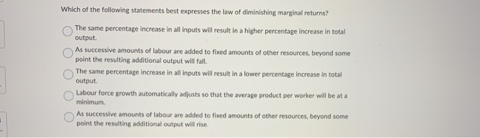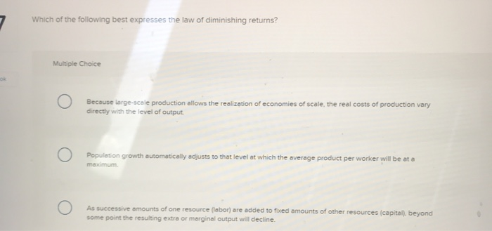 A Because large-scale production allows the realization of economies of scale the real costs of production vary directly with the level of output. Expert Answer harryy answered this Was this answer helpful. Which of the following best expresses the law of diminishing returns. Which of the following best expresses the law of diminishing returns. As successive amounts of one resource labor are added to fixed amounts of other resources capital beyond some point the resulting extra output will decline Refer to the above data. The law of diminishing marginal returns is also referred to as the law of diminishing returns the principle of diminishing marginal productivity and the law of variable proportions This. A As successive amounts of one resource are added to fixed amounts of other resources beyond some point the resulting extra or marginal output will decline.